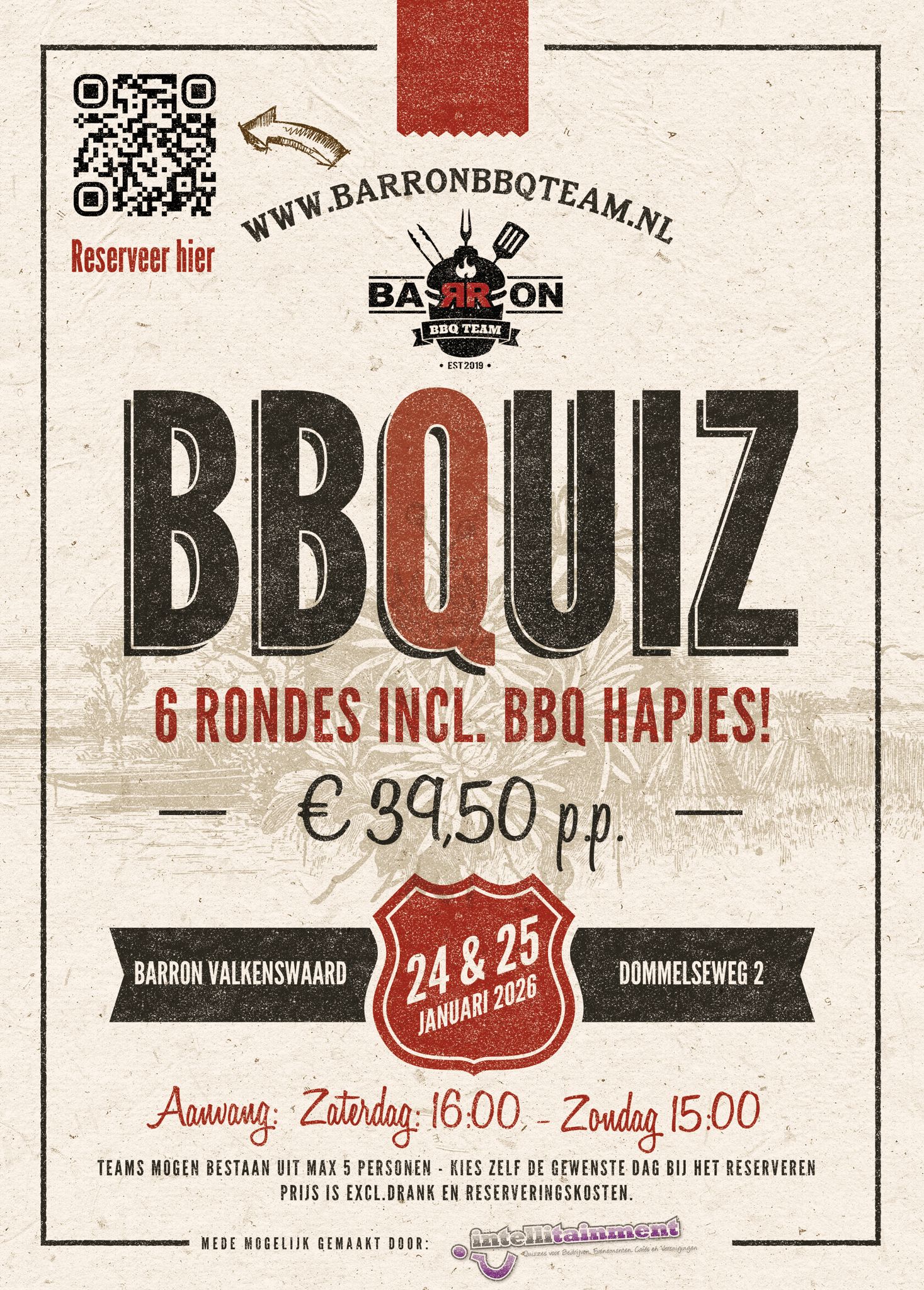 Zaterdag 24 en zondag 25 januari organiseert Barron BBQ Team voor de 4e keer de populaire BBQuiz🔥🍖🍷🍻 6 Quizrondes afgewisseld met 6 overheerlijke BBQ hapjes. 🥩🍔🍤🍗